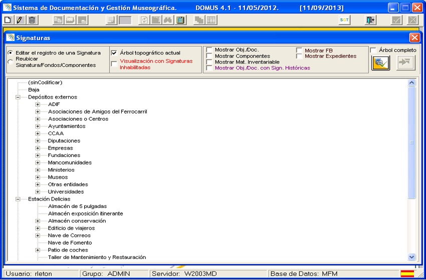 La mayor dificultad se nos presentó en el módulo Sistemas: Estructuras/Signaturas y Tesauros, 13 a la hora de generar una tabla jerarquizada que permitiera identificar la estructura física de nuestra Institución. Debemos recordar que la ubicación topográfica de los bienes históricos culturales ferroviarios es complicada, porque presentan una gran dispersión. Son bienes que no sólo se encuentran en el entorno físico de la Fundación: Museo del Ferrocarril de Madrid en exposición o en depósitos, o en el Palacio de Fernán Núñez, sino que están esparcidos por todo el territorio español; unos en calidad de cesión en depósito a entidades autonómicas o locales, Asociaciones de Amigos del Ferrocarril, y otros formando parte de conjuntos en las propias estaciones de ferrocarril de vía ancha, por lo que la citada tabla ha trascendido la propia estructura física de la Institución.