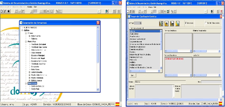- En el ejemplo de la izquierda observamos la generación de estructura establecida para el Palacio de Fernán Núñez, edificio complejo, ya que en realidad está compuesto por dos edificios, el antiguo que data de finales del siglo XVIII y otro más moderno, construido en la época de Renfe, en los años sesenta, para albergar el Archivo Histórico Ferroviario. En el ejemplo de la derecha, vemos las clasificaciones genéricas establecidas en las colecciones del Palacio.