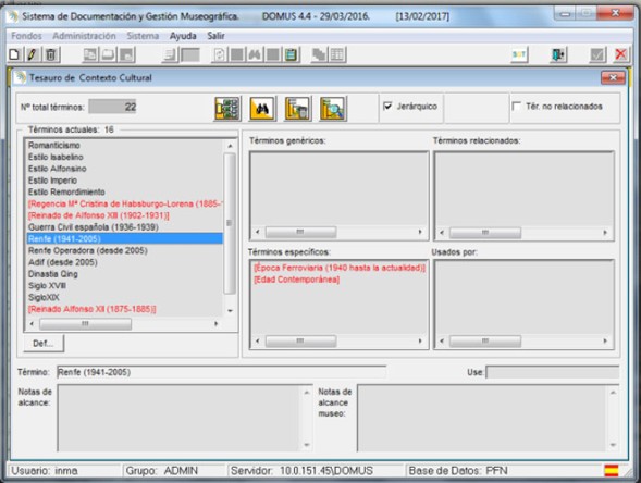 En el tesauro de contexto cultural consideramos que era necesario contemplar la época de Renfe (1941-2005), 17 ya que la empresa ferroviaria, constituida en 1941, ha sido la generadora de la mayor parte de las colecciones que hoy se conservan en la Fundación de los Ferrocarriles Españoles, tanto en el Museo del Ferrocarril de Madrid como en el Palacio de Fernán Núñez. Además, se hacía necesario especificar la escisión que se produce en el año 2005, por recomendación de la Comunidad Europea, cuando Renfe se divide en Adif y Renfe-Operadora. Por tanto, los fondos que ingresan en ese periodo contemplarán esta circunstancia.