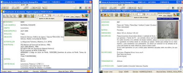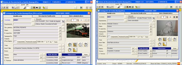 - En el ejemplo de la izquierda, se observa el módulo de catalogación de las colecciones del museo, con la pantalla de identificación del objeto, en este caso la locomotora de vapor 242-F-2009 CONFEDERACIÓN, construida por la Maquinista Terrestre y Marítima en 1955; mientras que el de la derecha nos presenta el módulo de catalogación de las colecciones del Palacio de Fernán Núñez, también con la pantalla de identificación del objeto, una quimera o león de Fo, realizado por la Real Fábrica de Alcora en el siglo XIX.