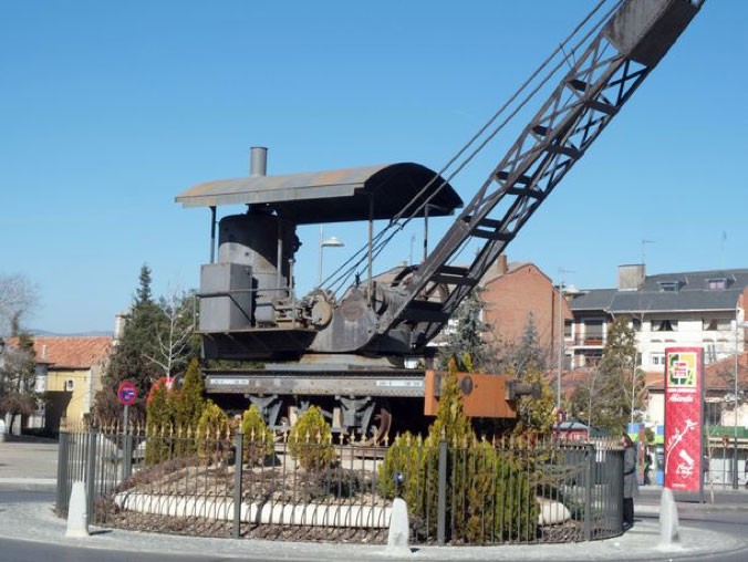 Grúa en pedestal en Collado Mediano (Madrid), cedida en depósito por el Museo del Ferrocarril de Madrid al Ayuntamiento de la citada localidad y exhibida en pedestal en una de sus plazas.