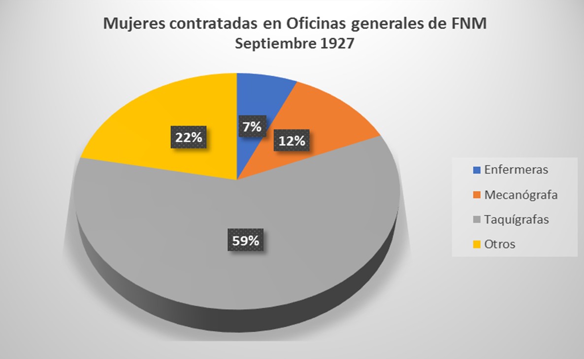 Durante el mes de septiembre de 1927, Ferrocarriles Nacionales de México contrató a 151 mujeres para ocupar los puestos de taquígrafas, en las modalidades de ayudantes y traductoras inglés-español; mecanógrafas, estenógrafa, telegrafistas, taquimecanógrafas; enfermeras,[7] administradoras, ayudantes de farmacéutico,[8] cocineras, galopinas, lavanderas, entre otras funciones, en las Oficinas Generales en los Departamentos de contabilidad, legal, personal, contaduría, auditores de trenes; tesorería general; tráfico; electricidad y telégrafos; vías y edificios; conservación de vías; almacenes; en el Hospital Colonia y el de Tuberculosis ubicado en Tlalpan.