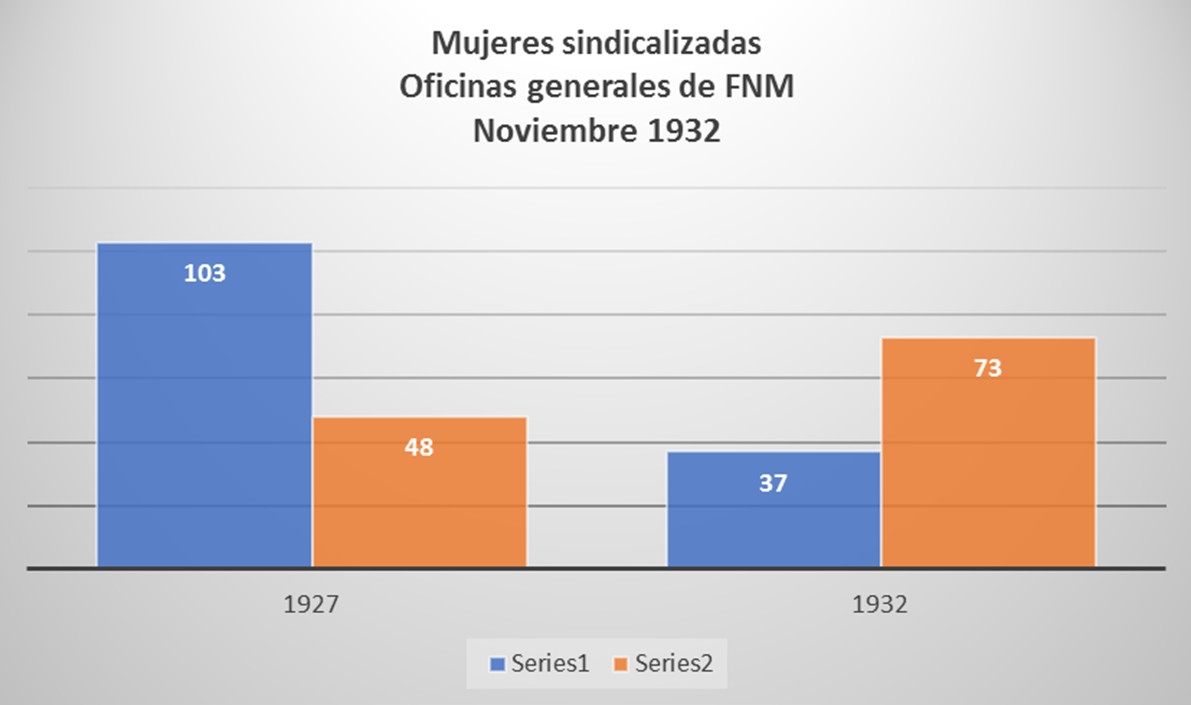 Para 1932, la empresa de los Nacionales estaba en un proceso de reorganización que implicó la supresión de algunas oficinas y provocó ajustes en la contratación de personal. Así, en noviembre de ese año se registró un total de 110 mujeres en Oficinas Generales, de las cuales 71 eran sindicalizadas y daban una cuota que iba de los 4 a los 6.75 pesos. Es decir que, en relación con lo registrado en 1927, el número de mujeres representadas por la Alianza aumentó de 48 a 73, en términos porcentuales paso de 31 a 65.7 % aunque el número de contratadas disminuyó de 151 a 108.