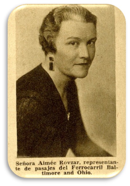 [25] Aimée Rovzar es hija del francés Eugene Dotour. Nació en la ciudad de México, fue educada en un convento francés en la misma ciudad donde permaneció la mayor parte de su vida hasta que contrajo matrimonio con el capitán Rovzar, veterano de la Guerra Mundial. En la ciudad de México, nacieron sus cuatro hijos y unos años más tarde la familia se trasladó a Washington, al momento en que su esposo fue nombrado gerente del hotel Wardman Park. Al poco tiempo sobrevino la muerte de su esposo y ella no pudo regresar a México, lejos de su familia y sin fondos tuvo que comenzar a trabajar en el referido hotel con sede en Nueva York, hasta conseguir un empleo en los ferrocarriles, para más información ver Revista Ferronales, t. vi, núm. 11, noviembre de 1935, p. 30
