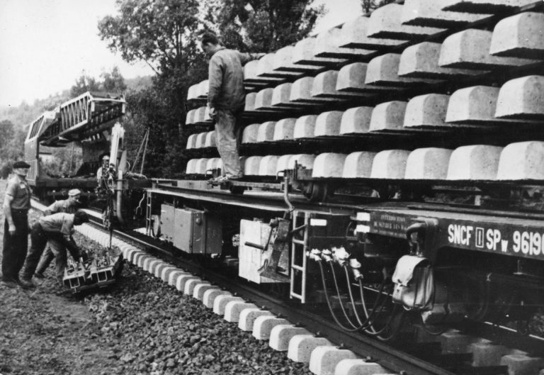 Plataforma con vía elástica prefabricada. Ferrocarriles franceses. Postal B/N. |