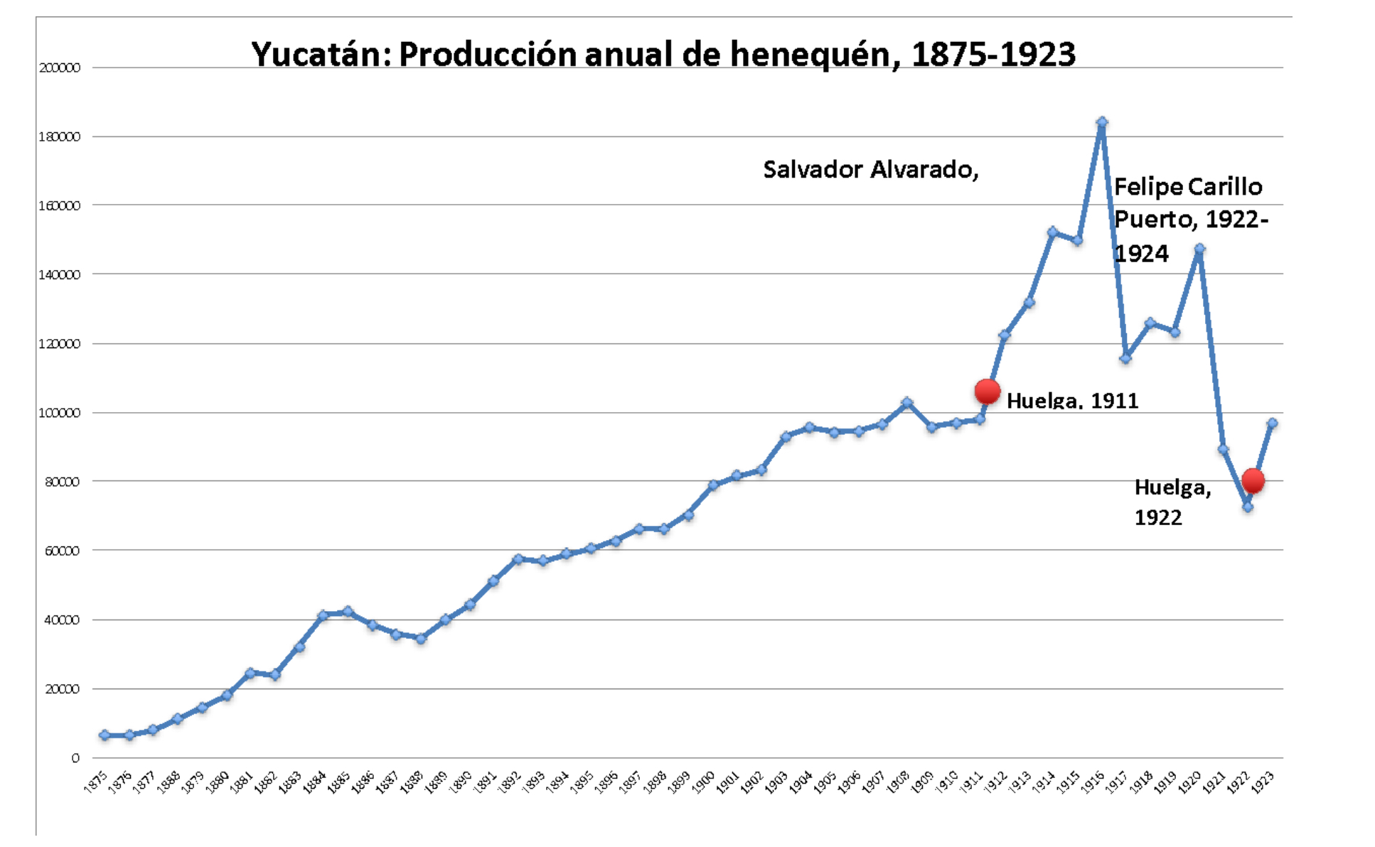 En este texto nos vamos a referir a los dos episodios huelguísticos mencionados, que marcan la distancia entre los gérmenes de la revolución y el inicio de su declive en Yucatán, señalados por el condicionante estructural que en ocasiones se pasa de lado o de plano se olvida al analizar la economía política de la revolución: la centralidad de las exportaciones de henequén en la península. Empezaremos por ahí, pasaremos a la huelga de 1911 y terminaremos con la paradoja de la huelga de 1922, estallada en contra del gobierno de Carrillo Puerto.