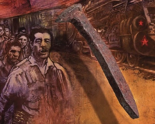 Detalle del cartel conmemorativo del 60 aniversario del movimiento ferrocarrilero, pieza de Mauricio Gómez Morin.